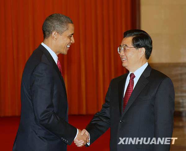 11月17日上午,国家主席胡锦涛在北京人民大会堂北大厅为美国总统奥巴马访华举行欢迎仪式。新华社记者 李学仁 摄