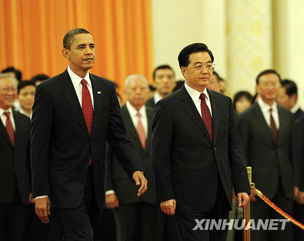 11月17日上午,国家主席胡锦涛在北京人民大会堂北大厅为美国总统奥巴马访华举行欢迎仪式。新华社记者 兰红光 摄