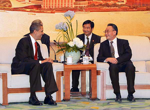 外交部长杨洁篪、全国人大外事委员会主任委员李肇星、中国驻美国大使周文重等参加会见。