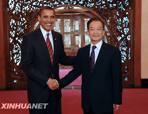 11月18日,中国国务院总理温家宝在北京钓鱼台国宾馆会见正在中国进行国事访问的美国总统奥巴马。新华社记者 马占成 摄