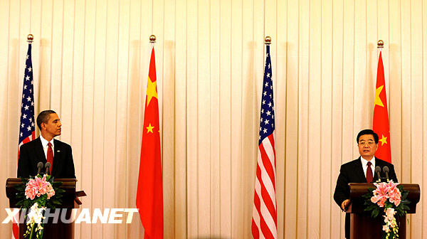 11月17日,中国国家主席胡锦涛和美国总统奥巴马在北京人民大会堂共同会见中外记者。新华社记者李学仁摄