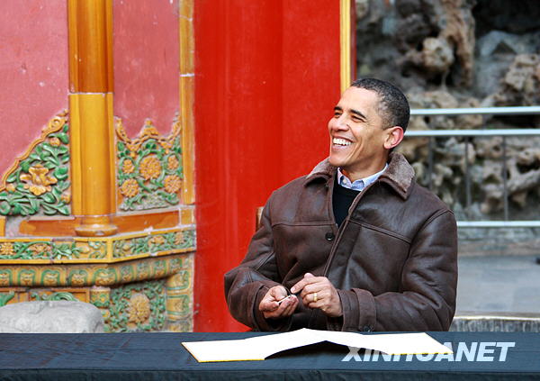 11月17日,正在中国进行国事访问的美国总统奥巴马参观北京故宫。这是奥巴马在留言簿上留言。新华社记者庞兴雷摄