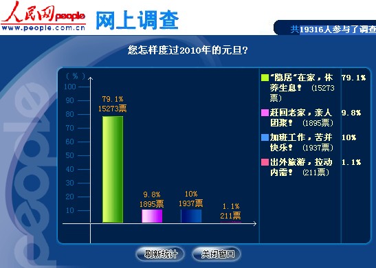 截至1月3日12时12分,共有19316位网友参与投票,79.1%的网友表示要"隐居"在家,休养生息,为2010年工作与生活的各方面再上一个台阶做好充分的准备。10%的网友投票表示要加班工作,虽然很辛苦,但是想到可以拿到加班工资,仍然感到很快乐。9.8%的网友表示要趁着三天假期赶回老家,与亲人团聚,共同迎接新年的到来,将错过的时光弥补回来。还有1.1%的网友对山水风光很着迷,他们表示要外出旅游,拉动内需,一边游历一边给国家做贡献。