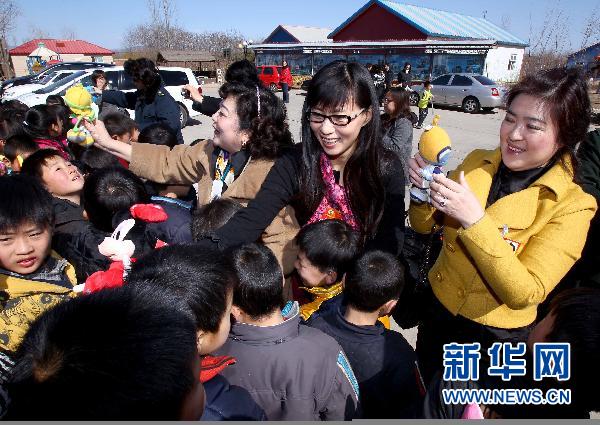 3月6日,全国政协委员万山红、张晓梅、何勇智(从右至左)在“太阳村”向孩子赠送礼物。新华社记者 陈建力摄