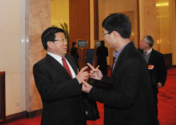 2011年3月10日9时,十一届全国人大四次会议举行第二次全体会议,听取全国人大常委会工作报告。图为全国人大代表、贵州省省长赵克志接受新华网记者专访。史玮 摄