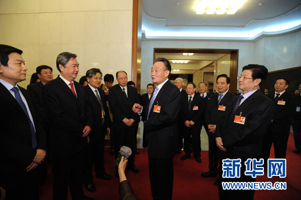 3月13日,中共中央政治局常委、全国人大常委会委员长吴邦国在北京人民大会堂看望参加两会新闻报道工作的中央新闻单位负责人。新华社记者 李学仁 摄