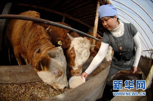 3月1日,宁夏同心县新华村的回族移民李彦福老人的女儿李梅花在家里喂牛。走进位于宁夏回族自治区同心县的回族移民新村新华村,映入眼帘的是一排排整齐的砖瓦房,干净的砂石路从村头一直通到村尾,路上不时传来孩子们嬉笑玩闹的声音。 新华社记者 彭昭之 摄