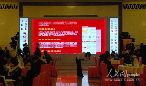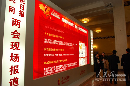 十一届全国人大四次会议在人民大会堂开幕当日,摘自互联网的数十条网友留言走进人民大会堂,在人民网设立的大屏幕上滚动播放,吸引了很多代表、委员驻足观看。