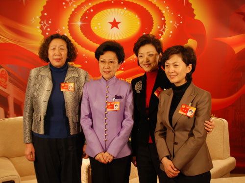 大会开始前,女政协委员接受新华网记者专访。左起分别为:范冰冰委员、李东东委员、杨澜委员、海霞委员。新华网 李平 摄(资料图片)
