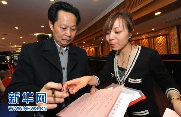 3月1日,一名北京国际饭店委员驻点的医疗组工作人员(右)向全国政协委员汪国新发放健康提示卡。当日,出席全国政协十一届四次会议的委员陆续抵京,在北京国际饭店委员驻点,工作人员和大会接待人员已经做好各方面准备,迎接委员的到来。 新华社记者岳月伟摄
