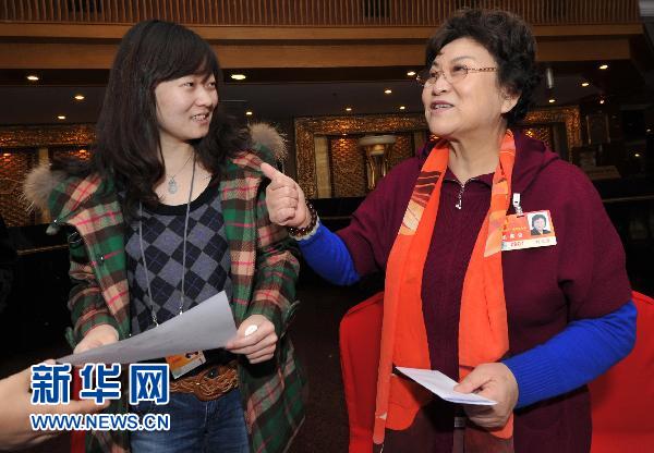 3月1日,全国政协委员刘兰芳(右)在北京国际饭店和工作人员交流。当日,参加全国政协十一届四次会议的全国政协委员陆续抵达北京各驻地报到。 新华社记者 岳月伟 摄