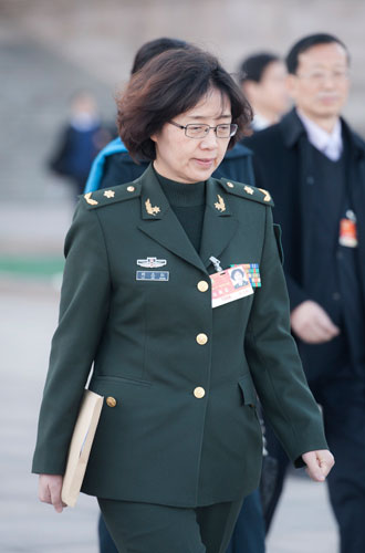 兰州军区副政委孔瑛微笑走入会场。(摄影 肖春阳 闫文)