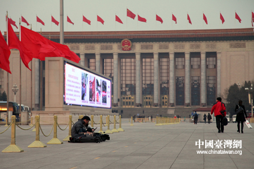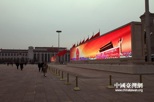 天安门广场上两块大屏幕正在播放宣传片。肖春阳、刘洋摄影报道