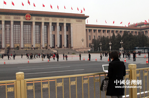 一位记者在大会堂前准备采访提纲。肖春阳、刘洋摄影报道