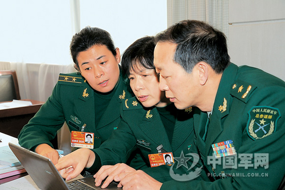 3月8日,曾屡夺军事五项团体冠军、5次打破世界纪录的徐蕾代表(左一),就小组讨论中的热点话题与裘山山代表(中)、冉崇伟代表在一起交流。本报记者 冯凯旋摄