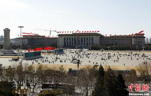 全国两会召开在即,人民大会堂东门外的广场上红旗招展。中新社发 廖攀 摄