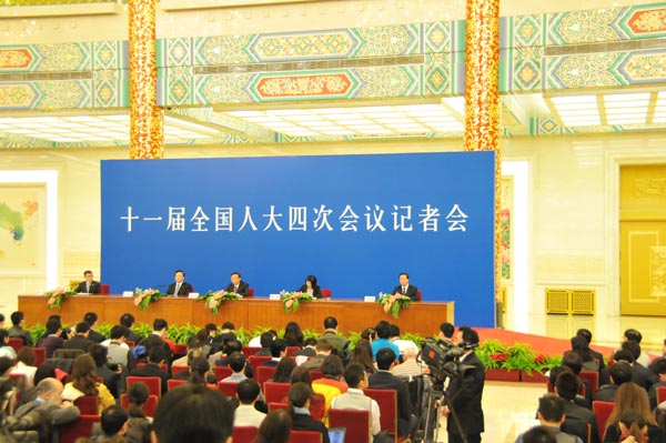 3月7日上午10时,十一届全国人大四次会议在人民大会堂三楼大厅举行中外记者会,由外交部部长杨洁篪就外交政策和对外关系问题答记者问。图为记者会现场。宋君毅 摄