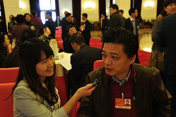 3月9日9时,全国政协十一届四次会议第二次全体会议在人民大会堂举行。图为全国政协委员崔永元接受新华网记者专访。宋君毅 摄