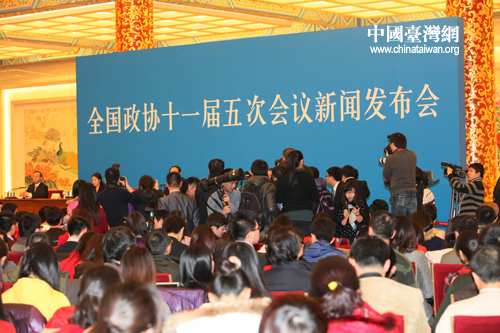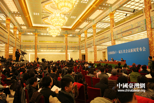中国台湾网3月2日北京消息 3月2日下午,全国政协十一届五次会议在人民大会堂三楼金色大厅举行新闻发布会,大会发言人赵启正发布新闻并回答中外记者的提问。赵启正宣布,全国政协十一届五次会议定于3月3日下午3时在人民大会堂开幕,3月13日上午闭幕,总共10天。根据已经公布的安排,全国政协十一届五次会议期间,将在主会场人民大会堂召开一场新闻发布会和两场记者会外,还将在两会新闻中心召开四场专题记者会,请政协委员回答中外记者关注的问题。 (记者 刘洋 张魏波 文/图)