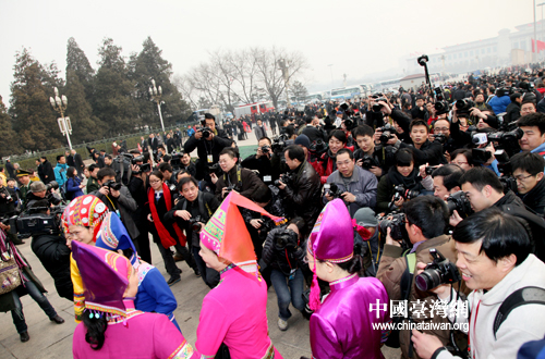 身穿少数民族服装的女代表在入会场时让记者“堵”的无法前行。