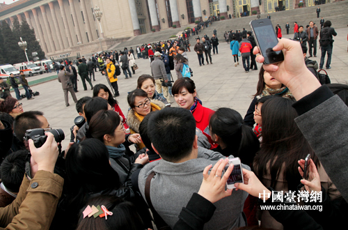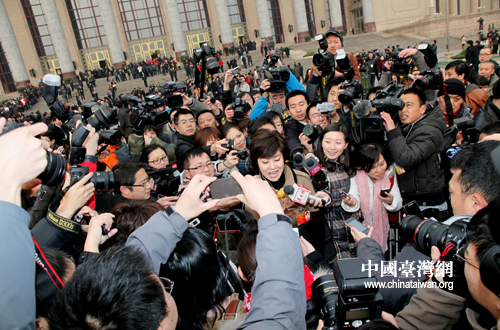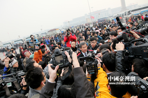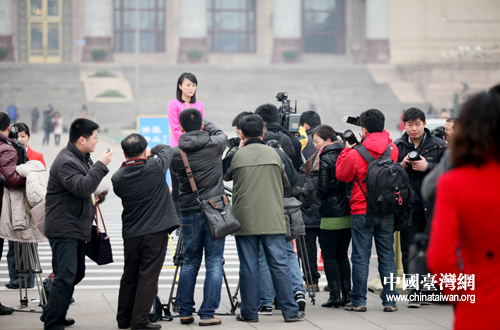 中国台湾网3月6日北京消息 3月5日,十一届全国人大五次会议开幕,人民大会堂前汇聚了来自国内外的媒体记者,代表委员、工作人员、会务保障的服务员以及记者本身都成了记者们的采访对象,上演了一场“围”“追”“堵”“截”的壮观景象。(两会记者刘洋、张魏波 特约记者摄影报道)