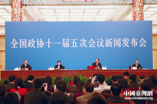 3月2日下午3时,全国政协十一届五次会议新闻发布会在北京人民大会堂三楼金色大厅举行,大会发言人赵启正介绍会议情况,并回答记者的提问。(中国台湾网 于斯文 摄)
