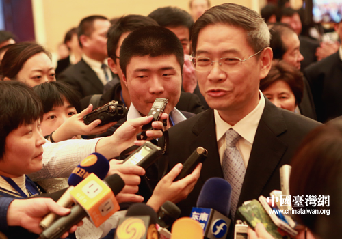中共中央台办、国务院台办主任张志军今日在第十一届两岸关系研讨会开幕式后接受两岸记者联合采访。(中国台湾网 高斯斯 摄)