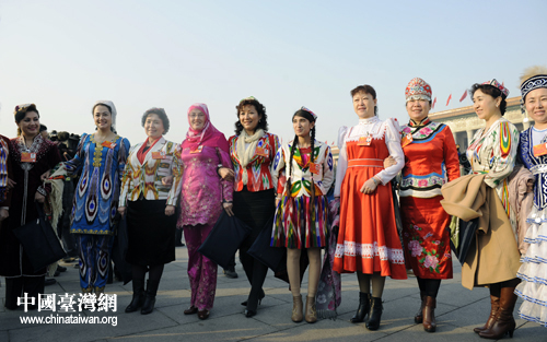 少数民族代表在人民大会堂前合影留念 (中国台湾网 发)