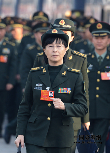 军队人大代表黄永俭一身戎装走向北京人民大会堂。(中国台湾网 发)