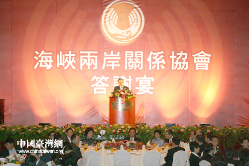 中国台湾网11月6日台北消息 海峡两岸关系协会6日晚在台北市圆山饭店举行答谢晚宴,宴请海基会董事长江丙坤及海基会有关人士,并庆祝两会成功签署四项协议。