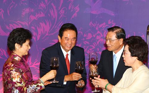 11月3日晚,海基会在台北101大楼举行宴会,欢迎陈云林会长率领的海协会协商代表团。这是陈云林夫妇和江丙坤夫妇共同举杯。新华社记者 邢广利 摄