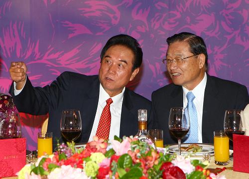 11月3日晚,海基会在台北101大楼举行宴会,欢迎陈云林会长率领的海协会协商代表团。这是陈云林和江丙坤在宴会上交谈。新华社记者 邢广利 摄