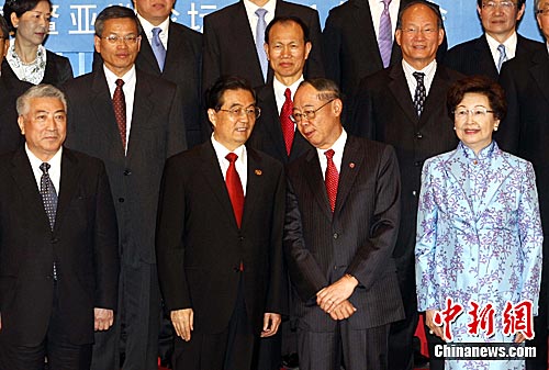 4月15日,国家主席胡锦涛出席博鳌亚洲论坛2011年年会,并与出席会议的台湾代表团团长钱复(右二)等代表合影交谈。中新社发 张宇 摄