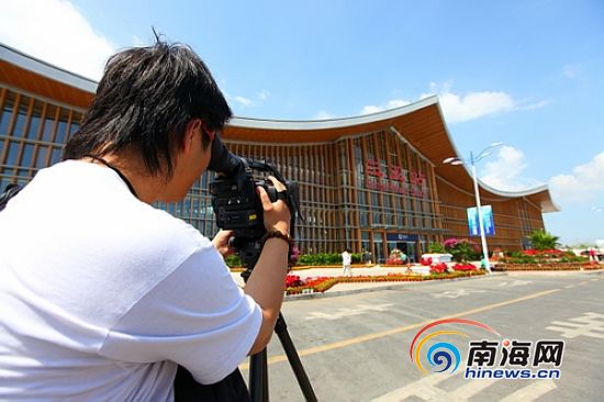 境外媒体记者正在用摄像机记录美丽的三亚火车站(南海网记者 骆云飞)