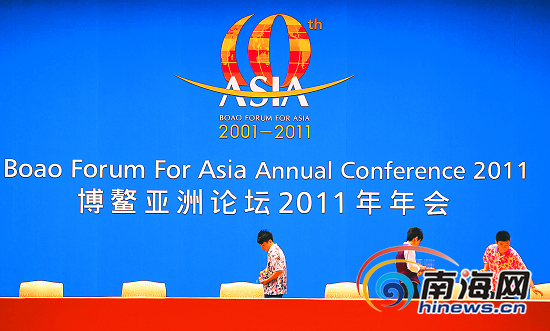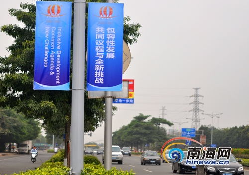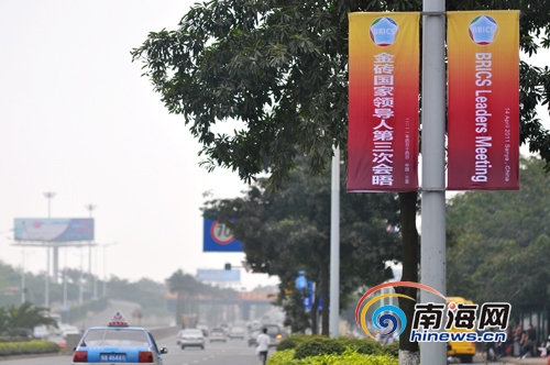 2011博鳌亚洲论坛年会和金砖国家领导人第三次会晤即将在海南省举行。6日上午,为迎接盛会的召开及来自世界各地的嘉宾,海口的龙昆路、海府路、国兴大道等主要路段均已挂上标语、横幅等营造盛会气氛。