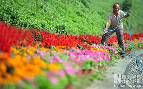 4月9日,一名博鳌镇的园林工人正在浇花。