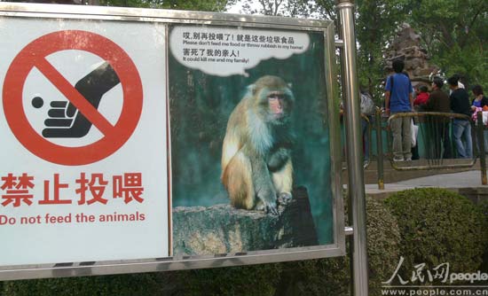 | 猴山旁,“禁止投喂”的牌子,一只猴子在哀求。 |