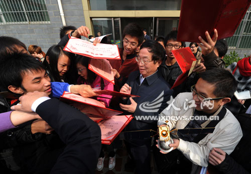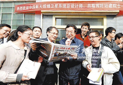 “《信息日报》,哦,知道,知道……”当叶培建院士讲学结束时,记者将今年10月8日刊发有《嫦娥二号轨道一次修正到位——多名航天专家为本报读者解读我国第二颗探月卫星》报道的报纸送到他的面前。叶培建院士拿着这份《信息日报》,饶有兴趣地看了起来。当看到他向记者介绍“嫦娥二号”的有关内容时,他看得很仔细,还用笔在文字下画起了线条。