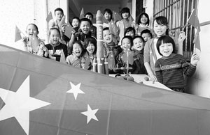9月30日,浙江省诸暨市城山民工子弟学校学生,制作了泥塑“嫦娥二号”发射火箭模型,以自己的方式庆祝国庆,祝祖国越来越强大。郭斌摄(资料图片)