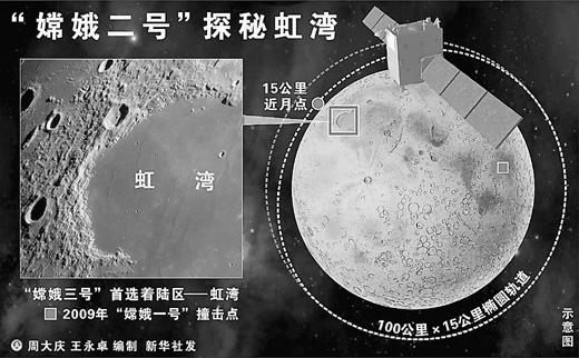 10月9日成功进入“使命轨道”,嫦娥二号卫星在这个100公里的环月圆轨道上调整并运行一段时间,随后将在月球背面进行1次降轨,使近月点高度降低为15公里,并在虹湾上空进行精细探测。