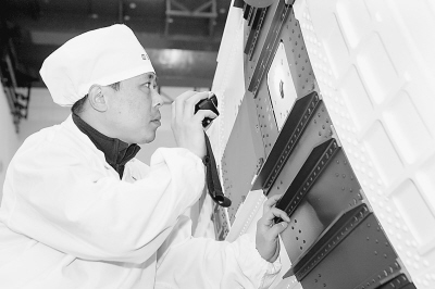 图为中国运载火箭技术研究院的科研人员对即将发射的长征三号甲火箭进行最后一次仔细检查。易渊摄