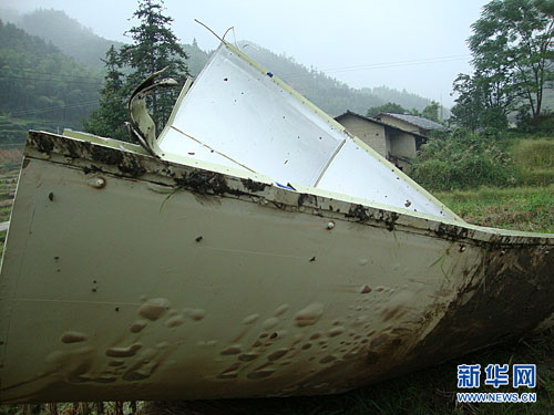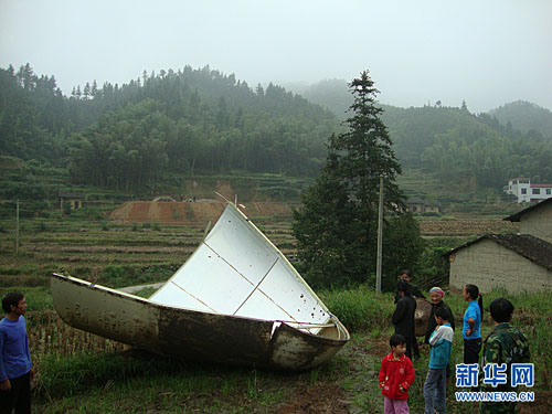 10月1日18时59分57秒,“嫦娥二号”卫星在西昌卫星发射中心成功升空后,卫星整流罩落在江西某地。当地武装部立即启动预案,及时派出民兵到现场维护秩序,等待上级部门回收。此次卫星整流罩落下时没有造成人员伤亡。新华社发(李建平 摄)