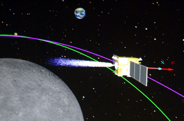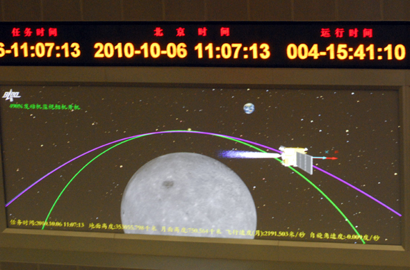 图为飞控大厅大屏幕上显示嫦娥二号打开发动机开始制动。 李少峰摄