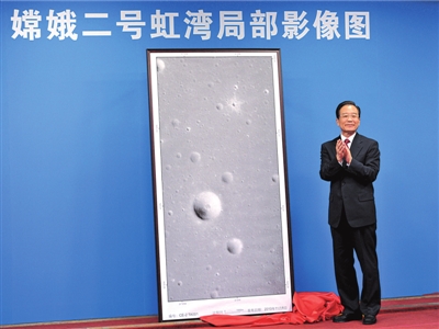 温家宝出席嫦娥二号月面虹湾局部影像图揭幕仪式并为影像图揭幕。昨天,国家国防科技工业局首次公布嫦娥二号卫星传回的嫦娥三号预选着陆区月球虹湾区域局部影像图等五张图片。根据该影像图,嫦娥三号探月卫星未来的落月点已大体确定。(详见A06、A07版)新华社发