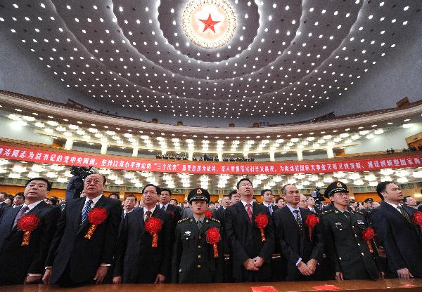 12月20日,中共中央、国务院、中央军委在北京人民大会堂举行大会,隆重庆祝我国探月工程嫦娥二号任务圆满成功。这是全体起立,高唱国歌。新华社记者刘建生摄