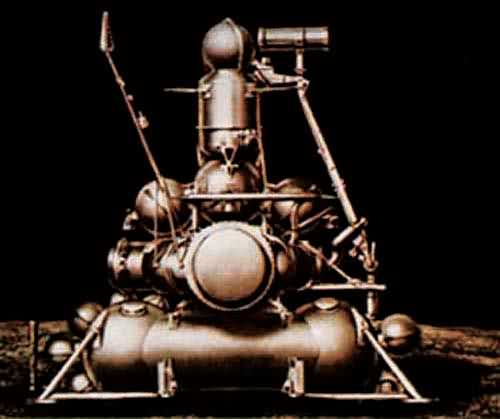 图3.世界上率先在月球软着陆的探测器,是1966年1月31日发射的月球9号。它经过79小时的长途飞行之后,在月球的风暴洋附近着陆,用摄像机拍摄了月面照片。这个探测器重1583千克,在到达距月面75千米时,重100千克的着陆舱与探测器本体分离,靠装在外面的自动充气气球缓慢着陆成功。