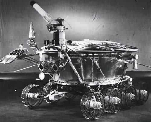 图5.1970年11月10日,月球17号载着世界上第一辆自动月球车上天。17日在月面雨海着陆后,月球车1号下到月面进行了10个半月的科学考察。这辆月球车重756千克,长2.2米,宽1.6米,装有电视摄像机和核能源装置。它在月球上行程10540米,考察了8千平方米月面地域,拍摄了200幅月球全景照片和20000多张月面照片,直到1971年10月4日核能耗尽才停止工作。