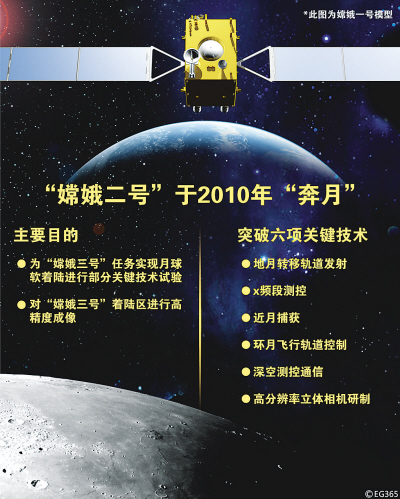 一是突破运载火箭直接将卫星发射至地月转移轨道的发射技术。嫦娥一号是先发射到地球附近的过渡轨道,再经过自身多次调整进入奔月轨道;而嫦娥二号卫星将由运载火箭直接送入近地点200公里,远地点约38万公里的奔月轨道,这样效率更高。嫦娥一号用了近14天时间进入工作轨道,嫦娥二号7天以内就可做到。相比嫦娥一号任务,嫦娥二号任务对运载火箭推力要求更大,入轨精度和控制精度要求更高。