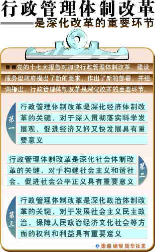 新华网北京3月13日电(记者季明、隋笑飞、石永红)党的十七届二中全会审议通过的《关于深化行政管理体制改革的意见》明确指出,我国深化行政管理体制改革的总体目标是,到2020年建立起比较完善的中国特色社会主义行政管理体制。作为本轮行政管理体制改革的“重头戏”,国务院机构改革方案日前也已提交十一届全国人大一次会议审议。