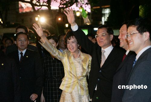 五月二日晚,中国国民党主席连战夫妇来到上海“新天地”,感受上海休闲夜生活的繁华并向欢迎他的人们挥手致意。作者:毛建军